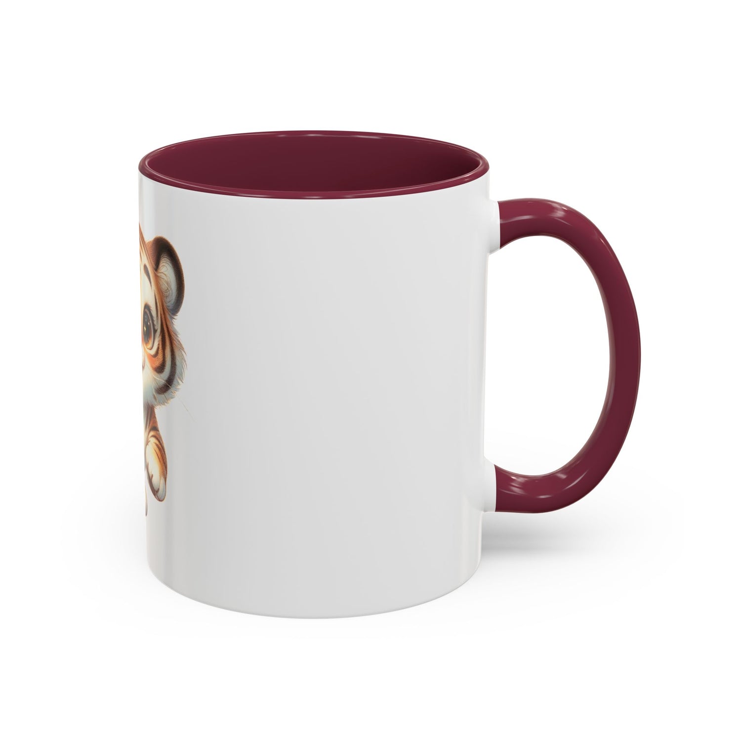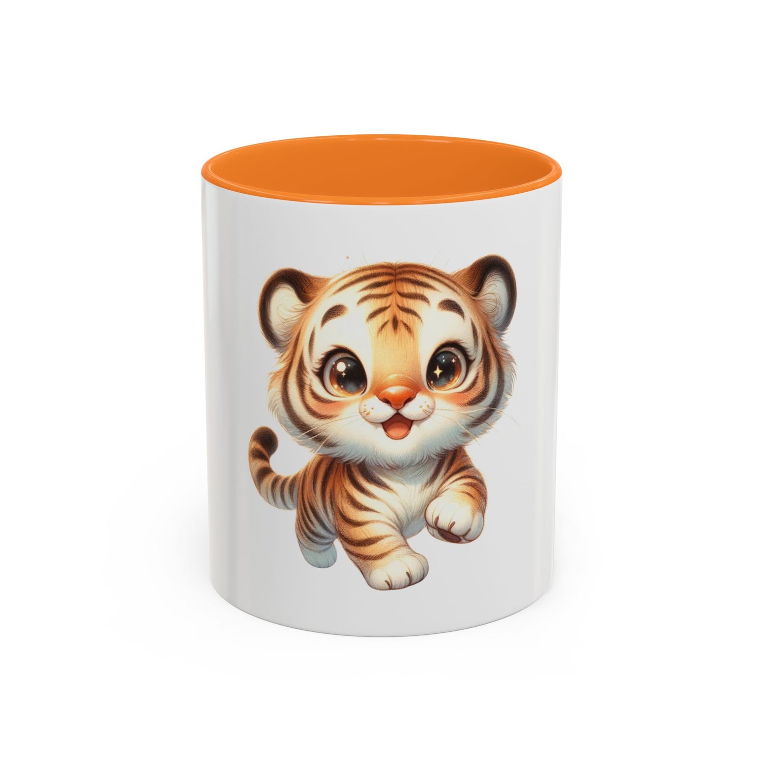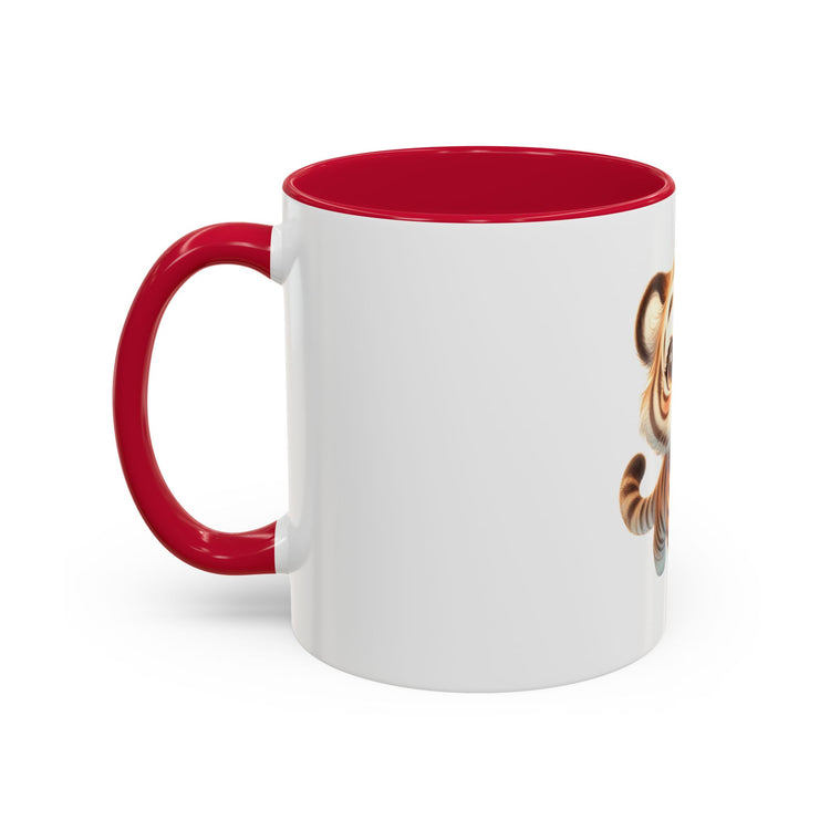 Brighten morning routines with this glossy ceramic mug featuring an adorable, wide-eyed tiger cub illustration. The playful design pops against the crisp white body while a colored handle and interior add a cheerful accent. Hold it by the comfortable C-shaped handle and feel the sturdy weight as you sip coffee, tea, or cocoa. The ORCA-coated surface keeps colors rich and resilient through daily use — safe for both dishwasher and microwave. Available in two sizes to suit quick refills or long, slow mornings, this mug brings a little whimsy to desks, kitchen counters, and cozy reading nooks.